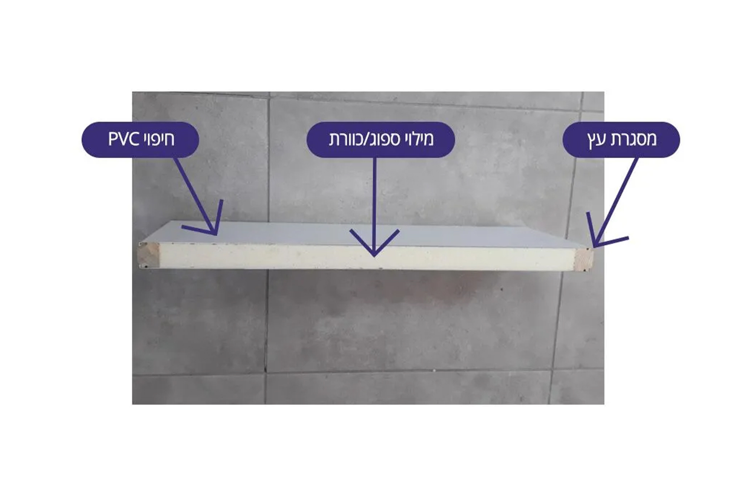 מצורפת תמונה של חיתוך דלת ומשקוף . בתמונה ניתן לראות כי הדלת מיוצרת בחתיכה אחת שלמה ומאותו סוג חומר שעמיד במים ונגד מזיקים.