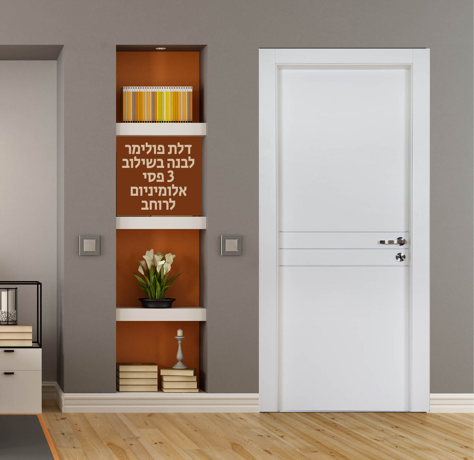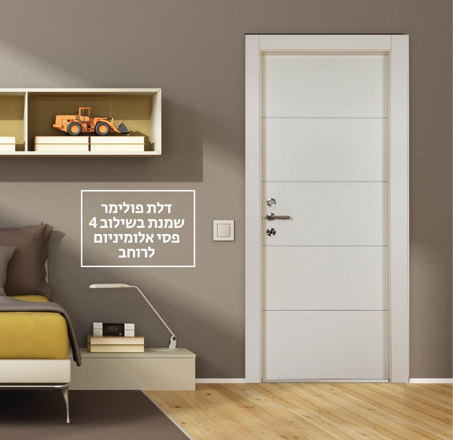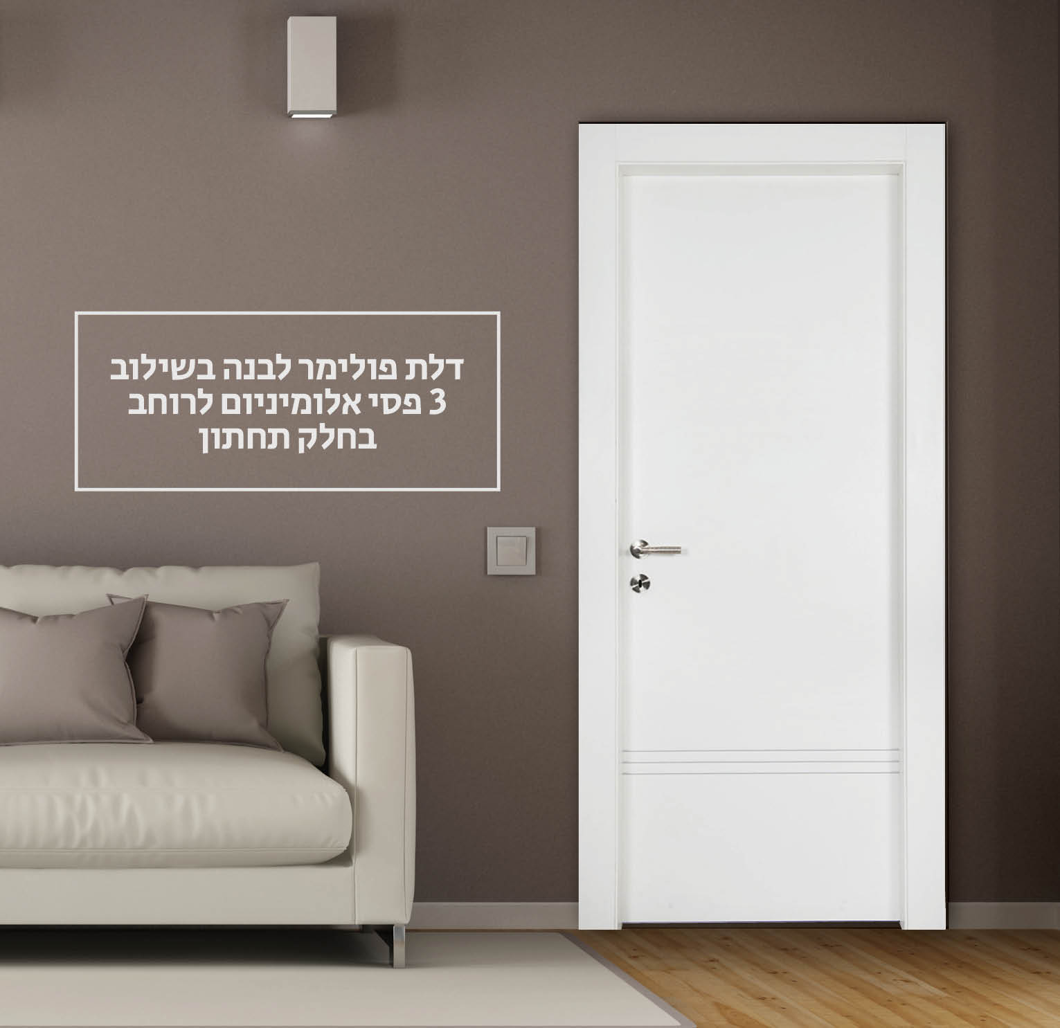 דלת פולימר לבנה בשילוב 3 פסי אלומיניום לרוחב